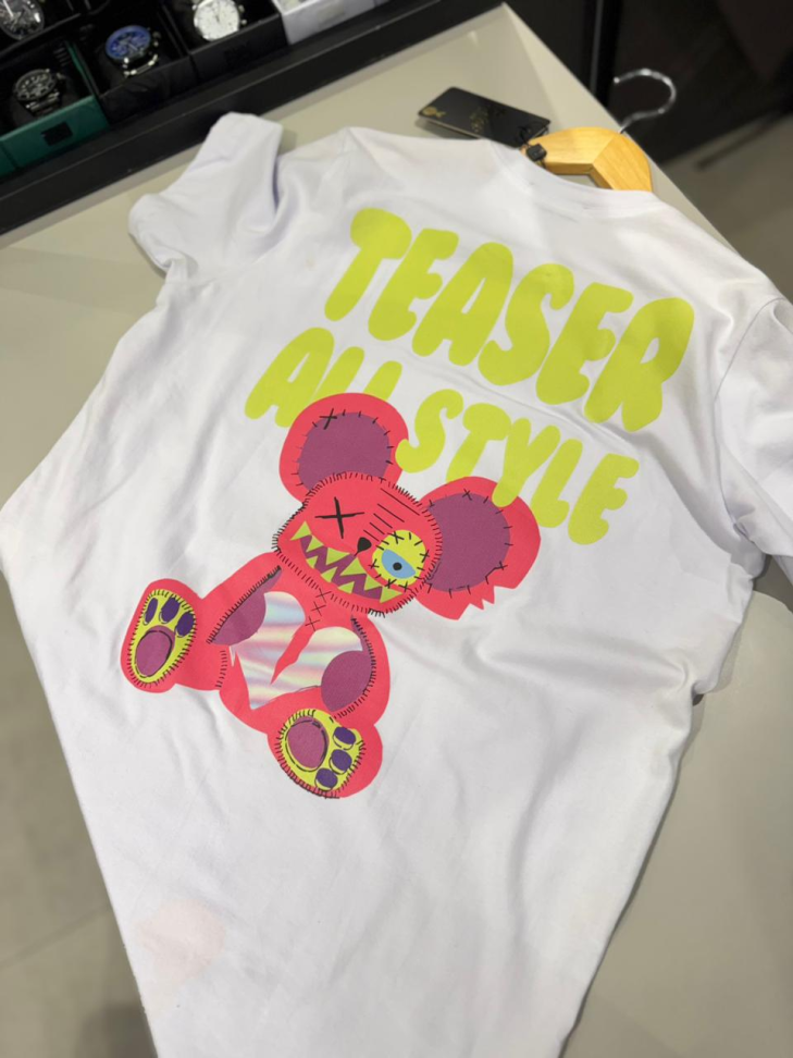 Esta é a Camiseta "Teaser" Branca Anjo Cupido, uma peça de vestuário masculino com um design casual, mas que se destaca pelo seu gráfico ousado e artístico. Ideal para quem busca um visual autêntico e cheio de personalidade no estilo streetwear ou casual.