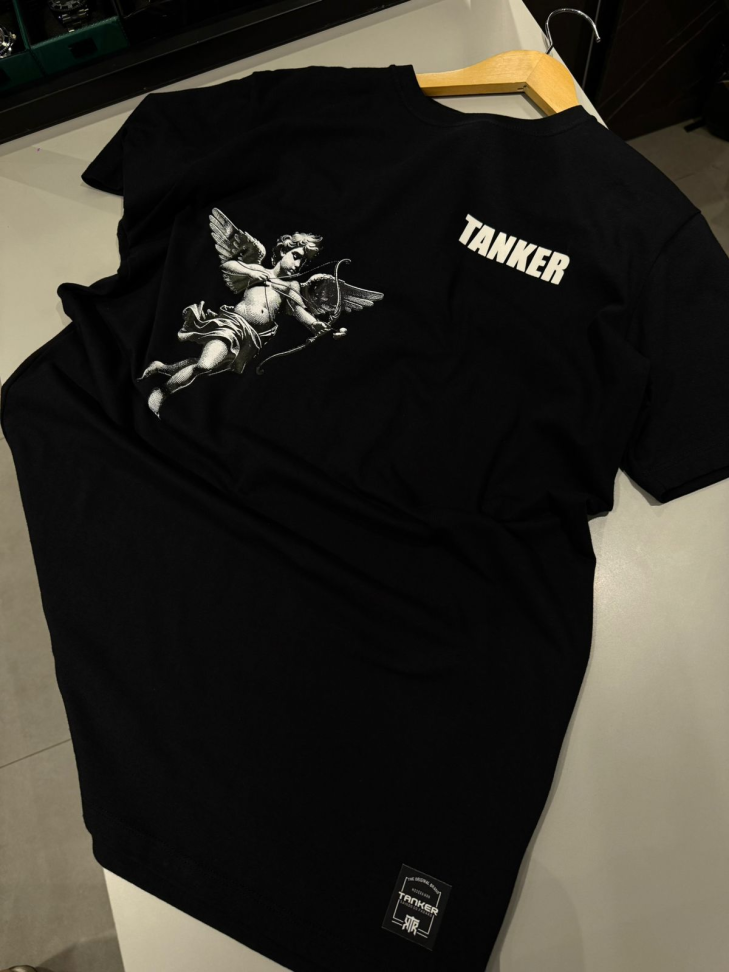 Design Gráfico Exclusivo: O grande destaque fica na parte de trás da camiseta. Apresenta um gráfico detalhado em preto e branco de um anjo/querubim segurando pistolas, cercado por grandes setas brancas inclinadas (estilo Off-White). A palavra "TANKER" aparece em letras maiúsculas e brancas na parte inferior, em uma faixa sobre as setas.
