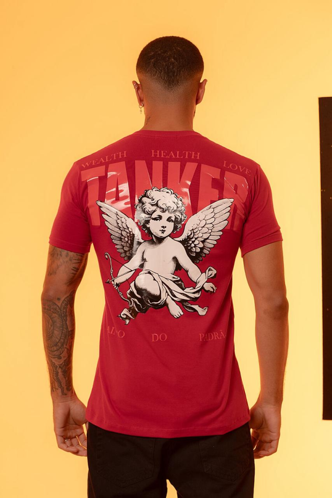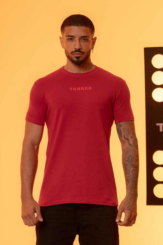 Design: Clássico, de manga curta e gola redonda. O diferencial fica por conta do logotipo triangular da marca "TANKER" no peito, que é aplicado em uma cor contrastante, provavelmente branco ou prata.