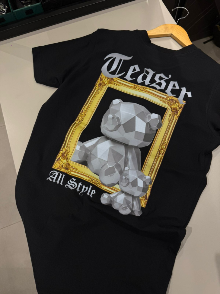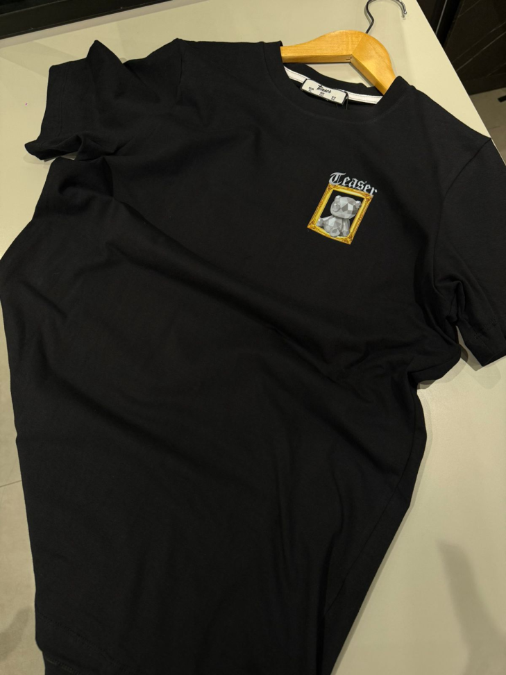 Design Exclusivo: O destaque é o nome da marca, "TEASER", aplicado no peito em uma fonte estilizada e na cor dourada, adicionando um ponto de destaque e exclusividade à peça.