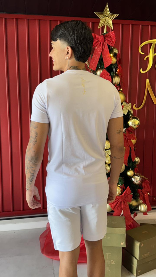 Material: Camiseta provavelmente em algodão de alta qualidade, a bermuda é de um tecido resistente, podendo ser Re-Nylon ou uma mistura, ideal para conforto e durabilidade.