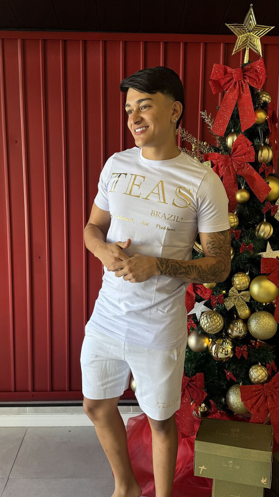 Design: A camiseta possui um corte reto/oversized, com gola redonda e mangas curtas. A estampa gráfica "X" nas costas e na frente é uma marca registrada da Teaser All Style. A bermuda estilo cargo possui bolsos utilitários e o icônico logotipo triangular da Prada no bolso lateral, adicionando um toque de luxo e funcionalidade.